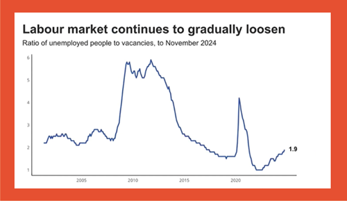 The latest data indicates that job postings are around 14% below pre-pandemic levels, whereas in many of these other countries, they remain comfortably above pre-pandemic levels. The UK also saw the sharpest year-on-year slowdown during 2024 out of all of these countries.